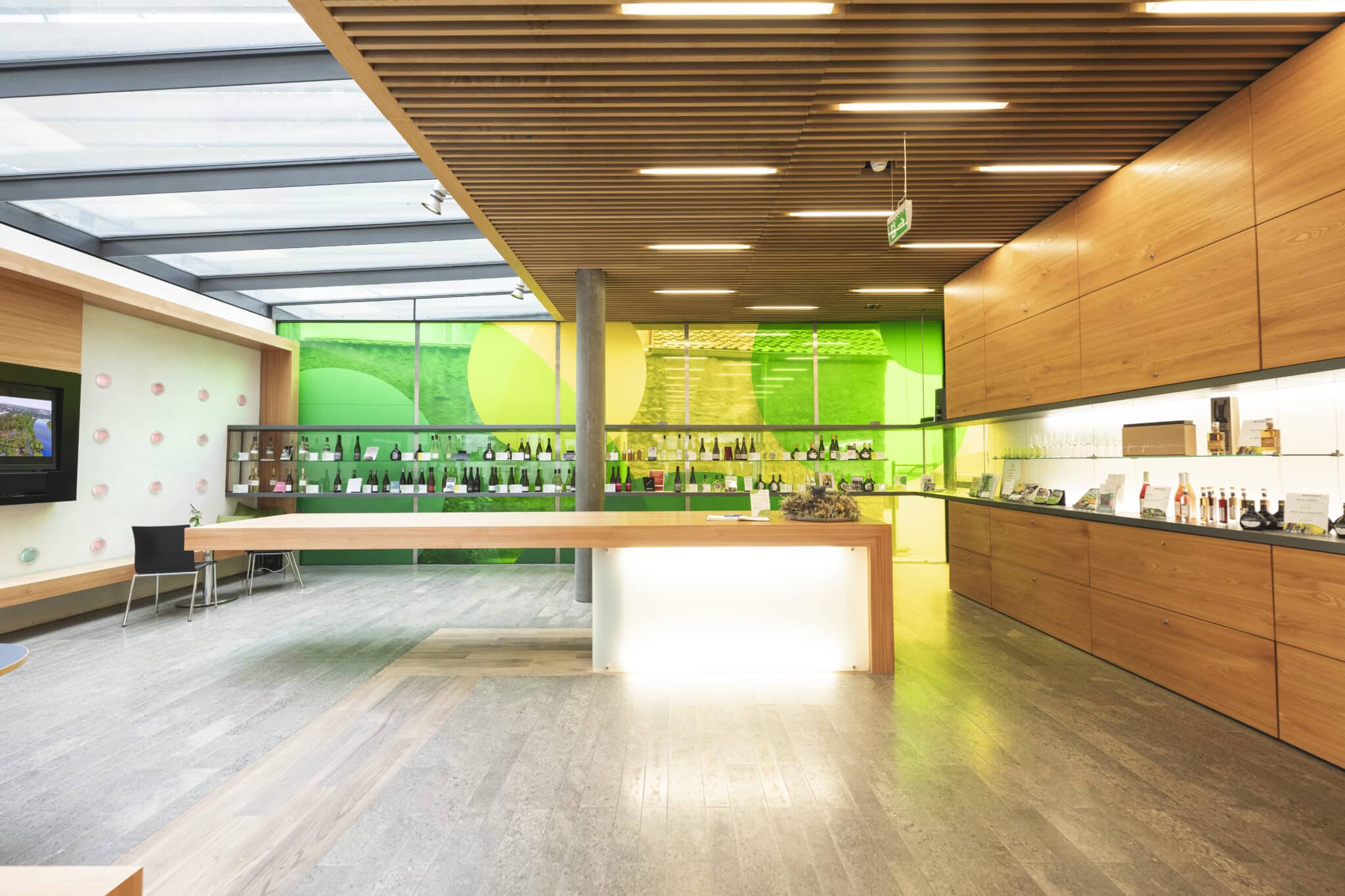 Die moderne, lichtdurchflutete Vinothek im KUK (Kultur- und Kommunikationszentrum) ist architektonisch ein echter Hingucker, gestaltet mit den Materialien und Farben der fränkischen Weinberge: Muschelkalk, Eichenholz und Reben-Grün.